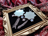 These earrings are approximately 8.5cm long and are made of three types of iridescent acrylic. The leverback attachment is silver colored brass. Please do not submerge this earring in water.